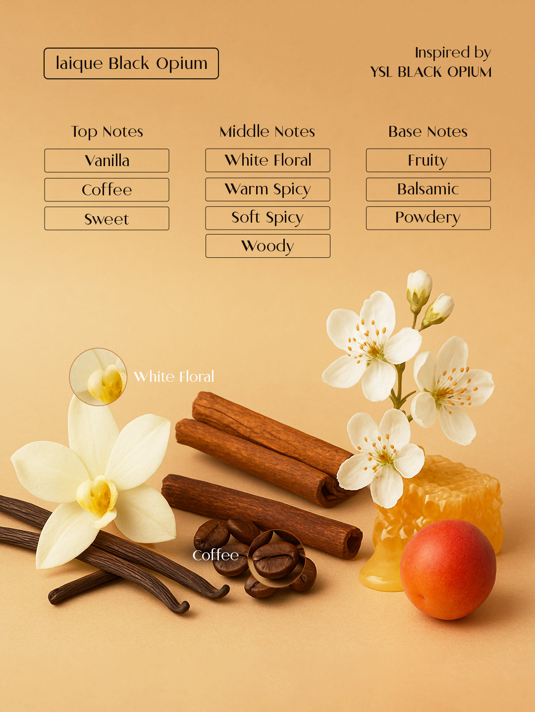 LaIque Black Opium: Experience the thrilling intensity of this iconic fragrance, inspired by YSL Black Opium. It opens with an addictive rush of rich Vanilla and dark Coffee notes, balanced by a profound Sweetness. The heart develops into a sensual bouquet of White Floral accords, beautifully contrasted by Warm and Soft Spicy warmth, and a hint of Woody depth. The scent settles into an enduring, captivating base of Fruity notes, Balsamic richness, and a soft Powdery trail.