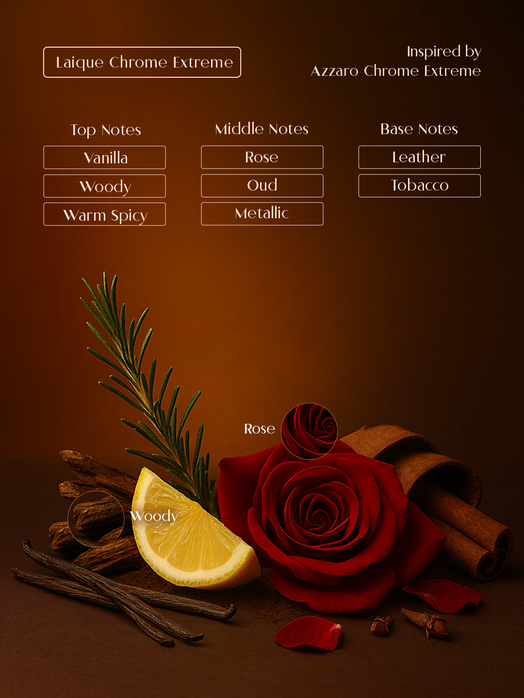 | Middle Notes | Rose, Oud, Metallic |