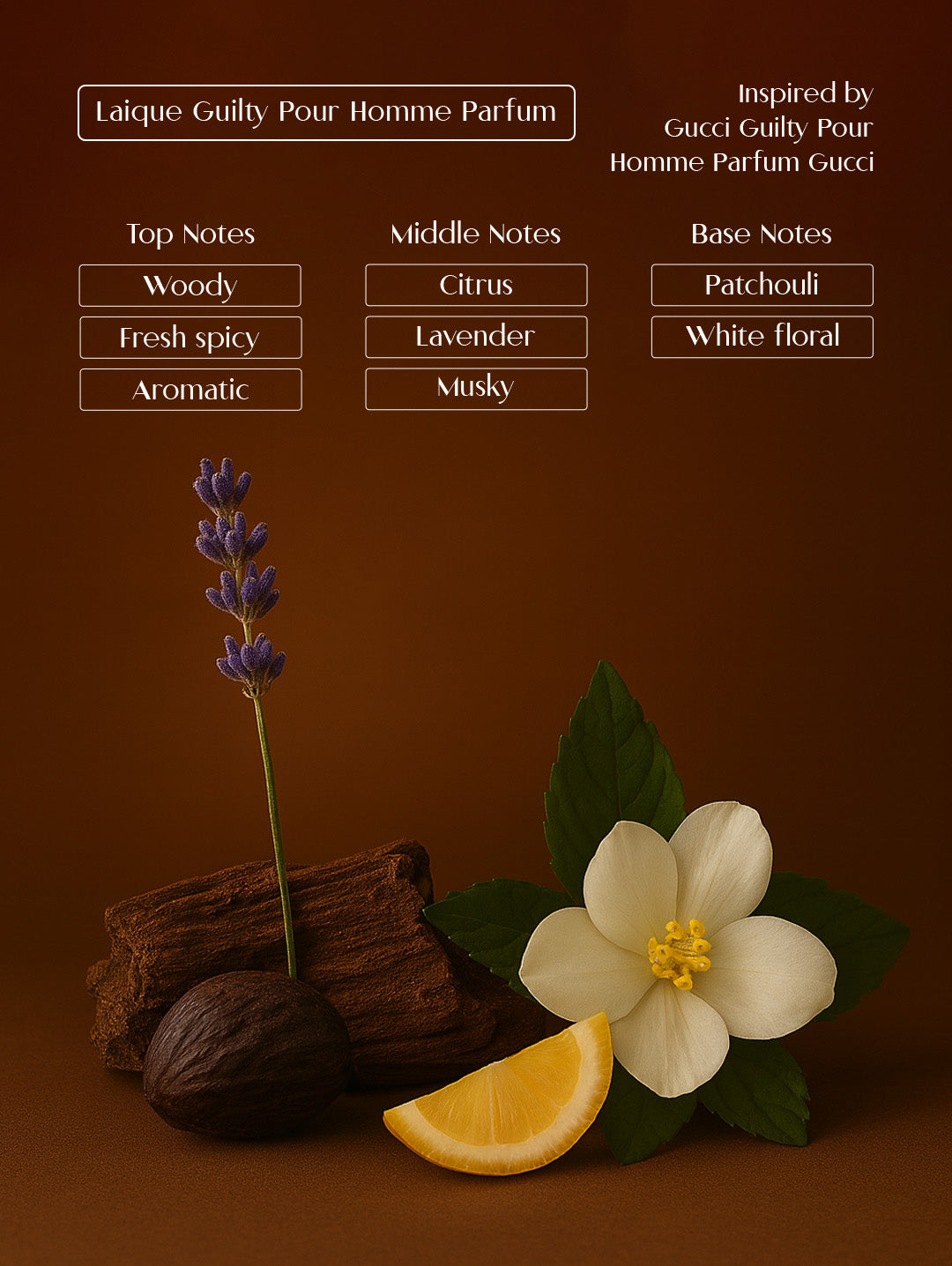 Discover the refined intensity of Laique Guilty Pour Homme Parfum, inspired by Gucci Guilty Pour Homme Parfum. The opening sets a commanding tone with a sharp blend of Woody, invigorating Fresh Spicy, and aromatic Aromatic top notes. The heart develops into a clean, sophisticated core featuring bright Citrus, soothing Lavender, and soft Musky middle notes. It finishes with an enduring, deep base of earthy Patchouli and elegant White Floral accords, perfecting this powerful modern classic.