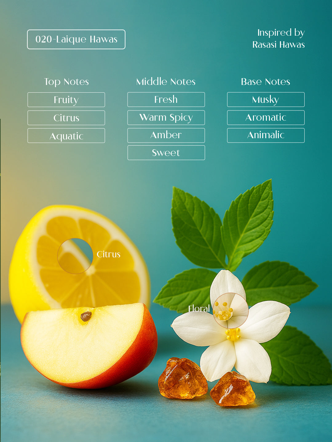Laïque Hawas: A powerful and captivating scent, inspired by Rasasi Hawas. It opens with an invigorating wave of Fruity, Citrus, and Aquatic Top Notes. The heart evolves into a striking blend of Freshness and Warm Spice, balanced by deep Amber and a Sweet touch. It settles into a long-lasting, memorable trail of Musky and Aromatic accords with a subtle Animalic depth. This is a fragrance built for confidence.