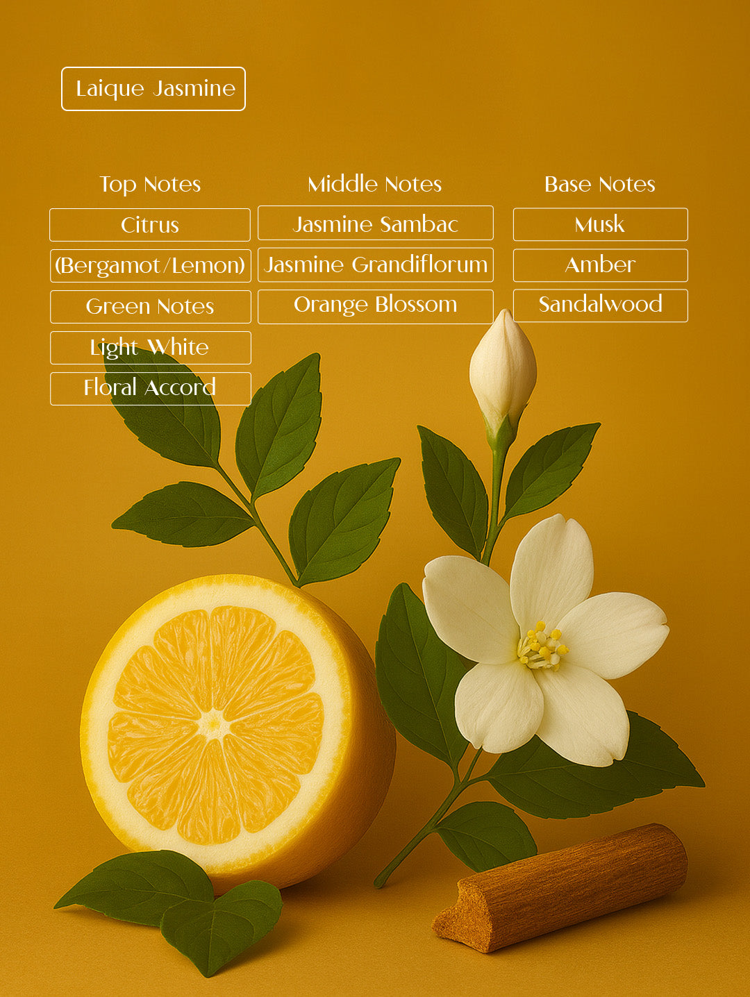 Laique Perfumes presents Laique Jasmine, a bright, uplifting floral fragrance crafted from pure citrus freshness and delicate jasmine blooms. It opens with sparkling citrus, bergamot/lemon, green notes, and a light white floral accord, moving into a radiant heart of jasmine sambac, jasmine grandiflorum, and orange blossom. The scent settles into a warm, comforting base of musk, amber, and sandalwood, creating a refreshing yet elegant jasmine aura perfect for everyday luxury.