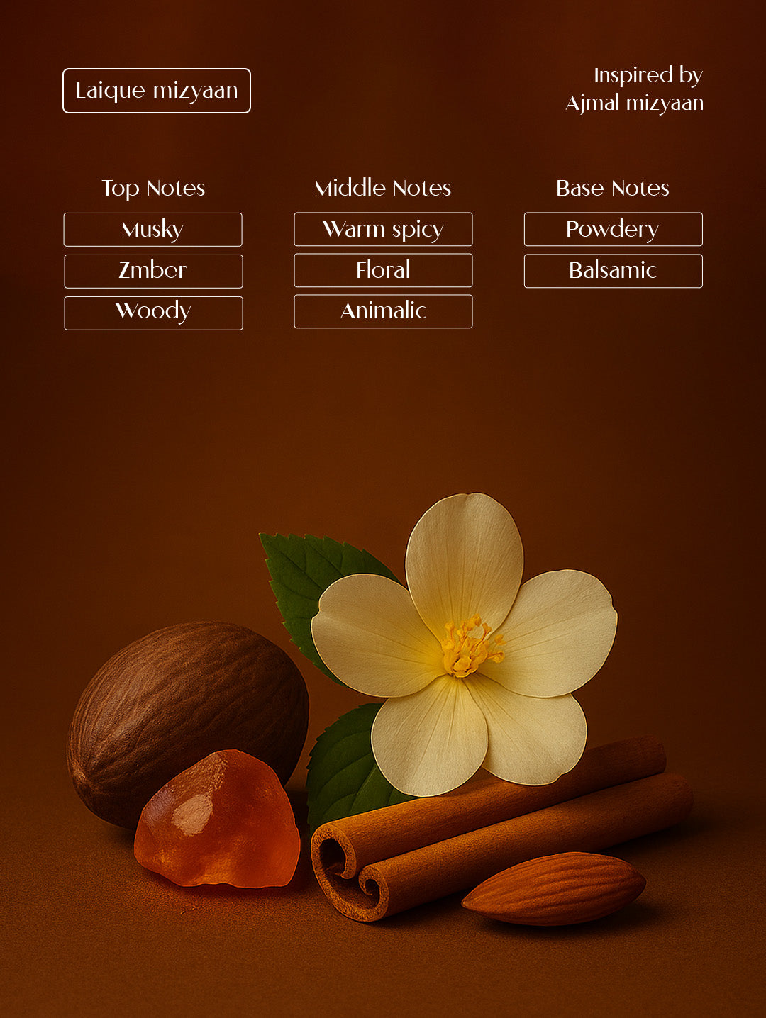 Discover the rich, velvety layers of Laïque Mizyaan, inspired by Ajmal Mizyaan. It opens with an embracing trio of soft Musky, deep Amber, and rustic Woody top notes. The heart warms further with an intimate blend of Warm Spicy, gentle Floral, and intriguing Animalic middle notes. The scent settles into a serene, comforting base of luxurious Powdery and smooth Balsamic accords, creating a profoundly inviting and long-lasting oriental aura.