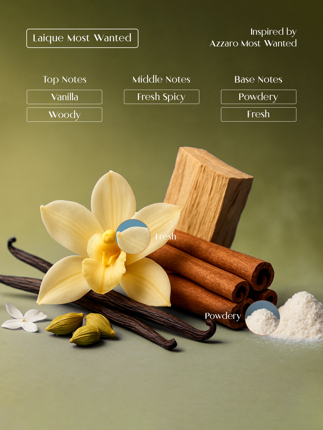 Laique Most Wanted is a daring masculine fragrance that embodies strength, elegance, and irresistible charm. It opens with the smooth richness of vanilla blended with deep woody accords, creating an instantly captivating introduction.
