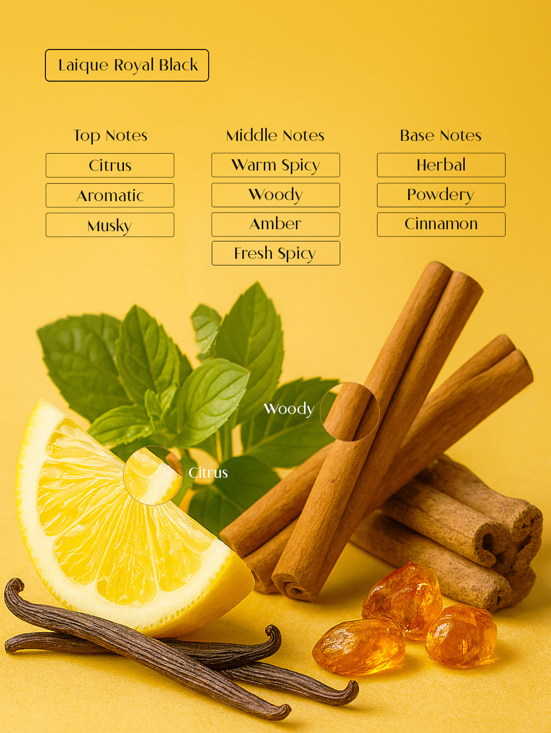 Laïque Royal Black: This scent opens with a compelling introduction of bright Citrus, lively Aromatic notes, and a clean Musky touch. The fragrance quickly evolves into a deep, luxurious heart of Warm and Fresh Spices, rich Woody accords, and golden Amber. It finally settles into a sophisticated, enduring base of warm Cinnamon, soft Powdery notes, and subtle Herbal freshness. This is a fragrance built for modern elegance.