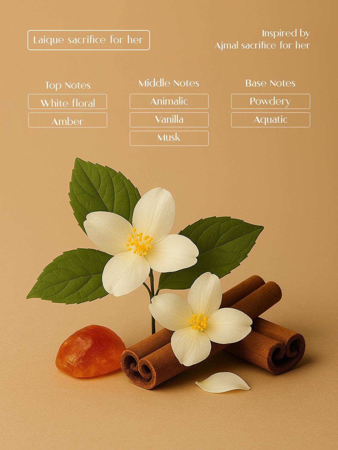 Discover the delicate devotion of Laique Sacrifice for Her, inspired by Ajmal Sacrifice for Her. The fragrance opens with a beautiful blend of soft White Floral and warm Amber top notes. The heart develops into a creamy, sensual center with rich Animalic, sweet Vanilla, and clean Musk middle notes. It settles into a tranquil, light base of comforting Powdery and refreshing Aquatic accords, resulting in a gentle, yet unforgettable, feminine essence.