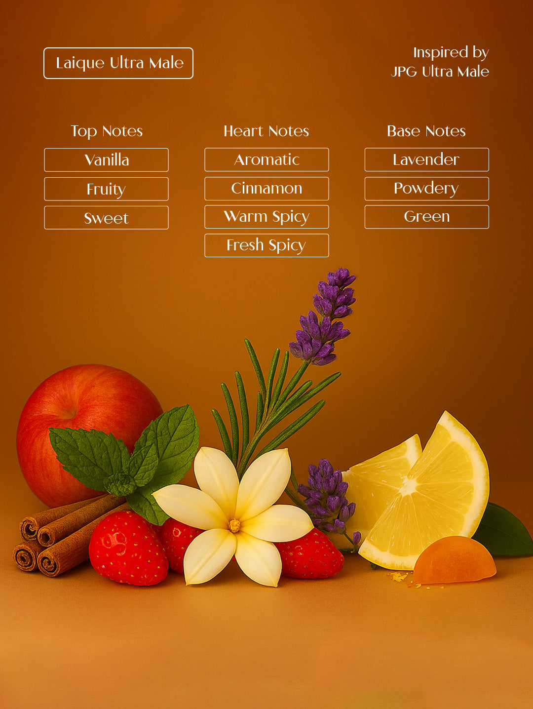 Laique Ultra Male: Experience the magnetic appeal of this irresistible fragrance, inspired by Jpg Ultra Male. It opens with a seductive rush of Vanilla and Sweet, Fruity notes. The heart quickly warms up, featuring a complex and intense blend of Aromatic, Cinnamon, Warm Spicy, and Fresh Spicy accords. The dry-down settles into a comforting yet powerful base of classic Lavender, Powdery softness, and a hint of Green.