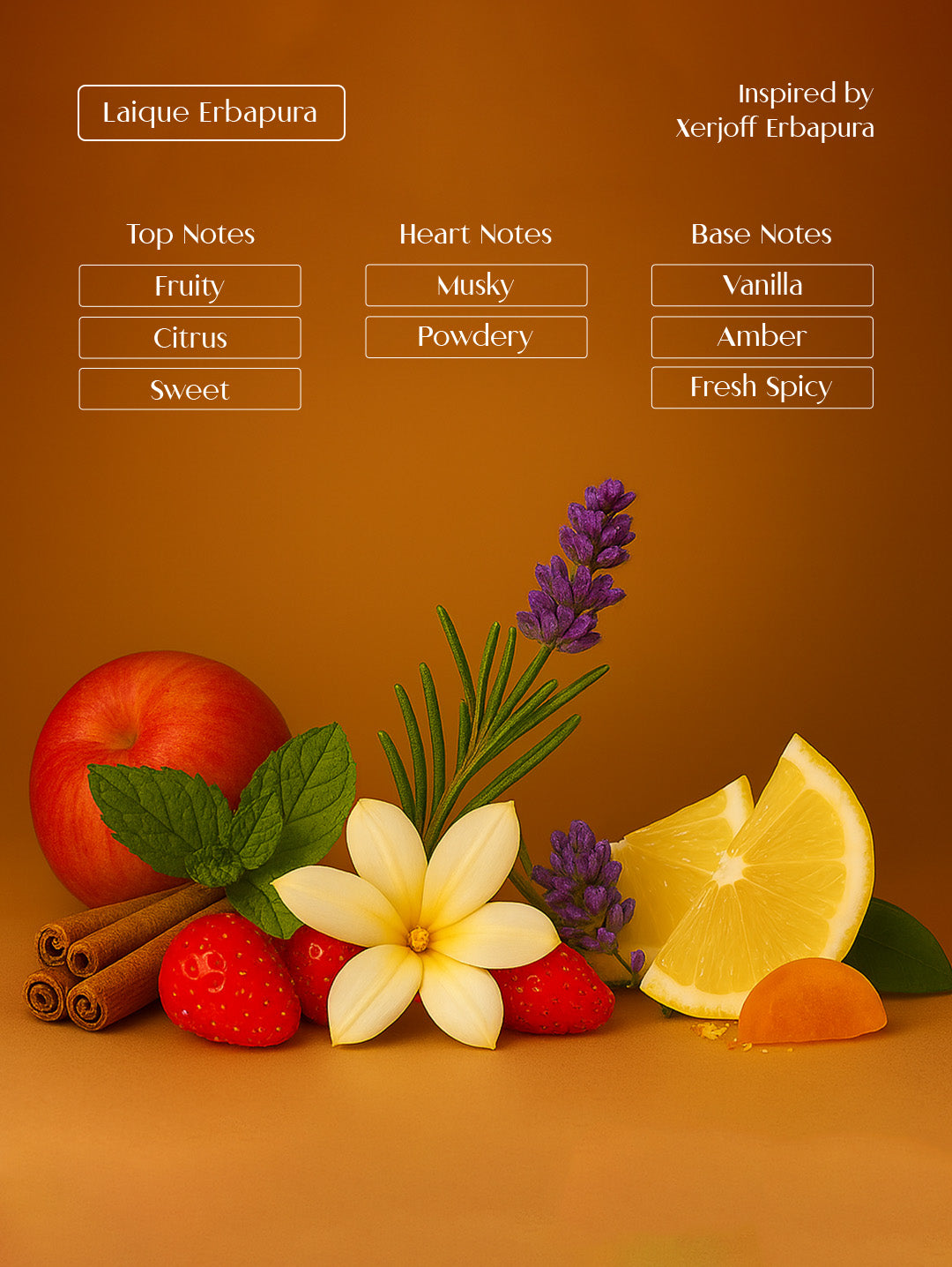 Experience the bright, intoxicating charm of Laïque ErbaPura, inspired by Xerjoff Erba Pura. It opens with an explosion of Fruity, Citrus, and Sweet top notes, creating an immediate, uplifting rush. The heart introduces a smooth, comforting blend of Musky and Powdery notes. The scent concludes with a luxurious and lasting base of warm Vanilla, deep Amber, and a hint of Fresh Spicy sophistication, making it undeniably magnetic.