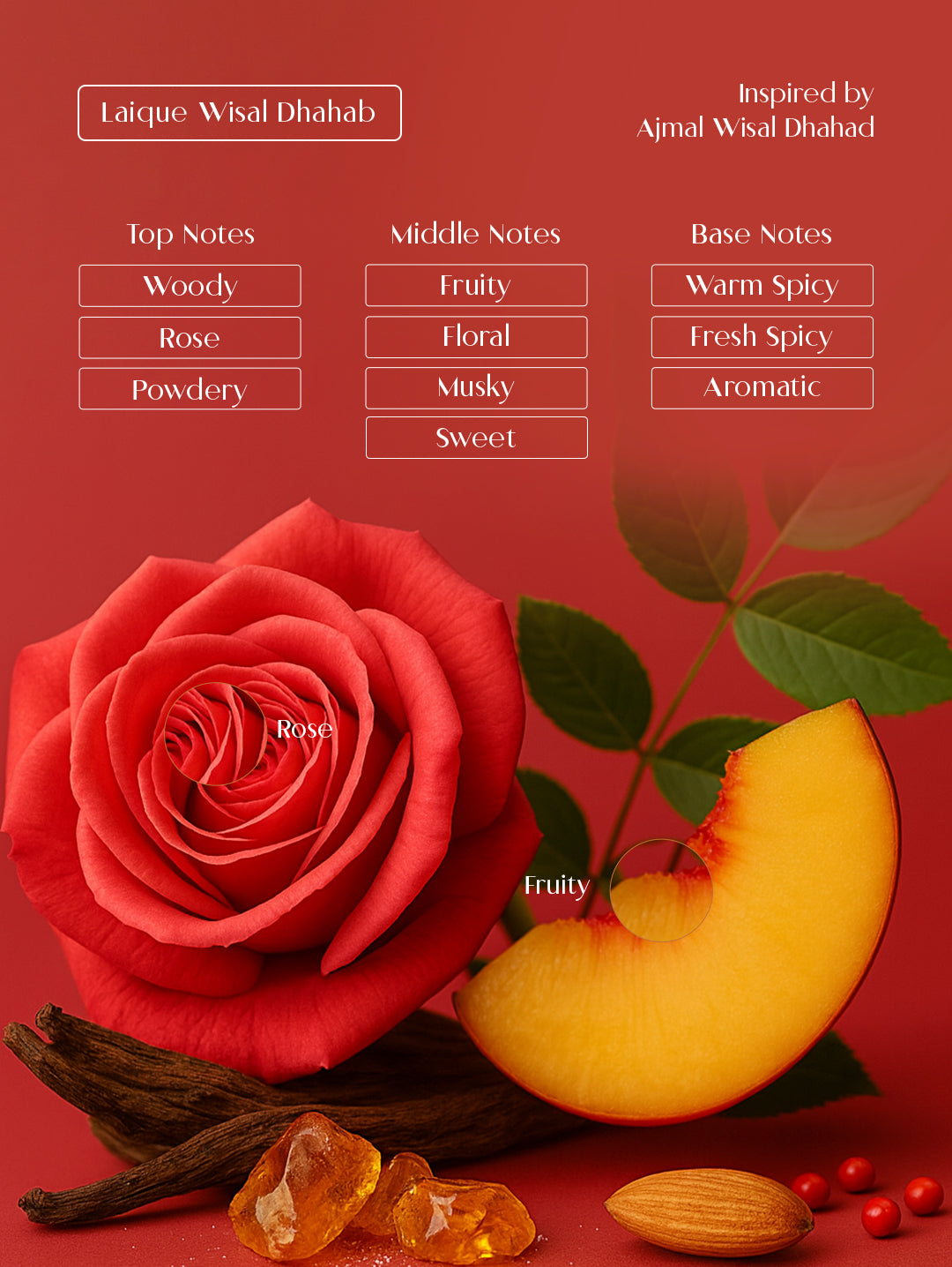 A fragrance that shines with golden warmth and captivating charm, Laique Wisal Dhahab is a radiant blend of florals, fruits, and soft woods. It embodies sophistication, freshness, and sensual sweetness — a scent that celebrates elegance in every breath.